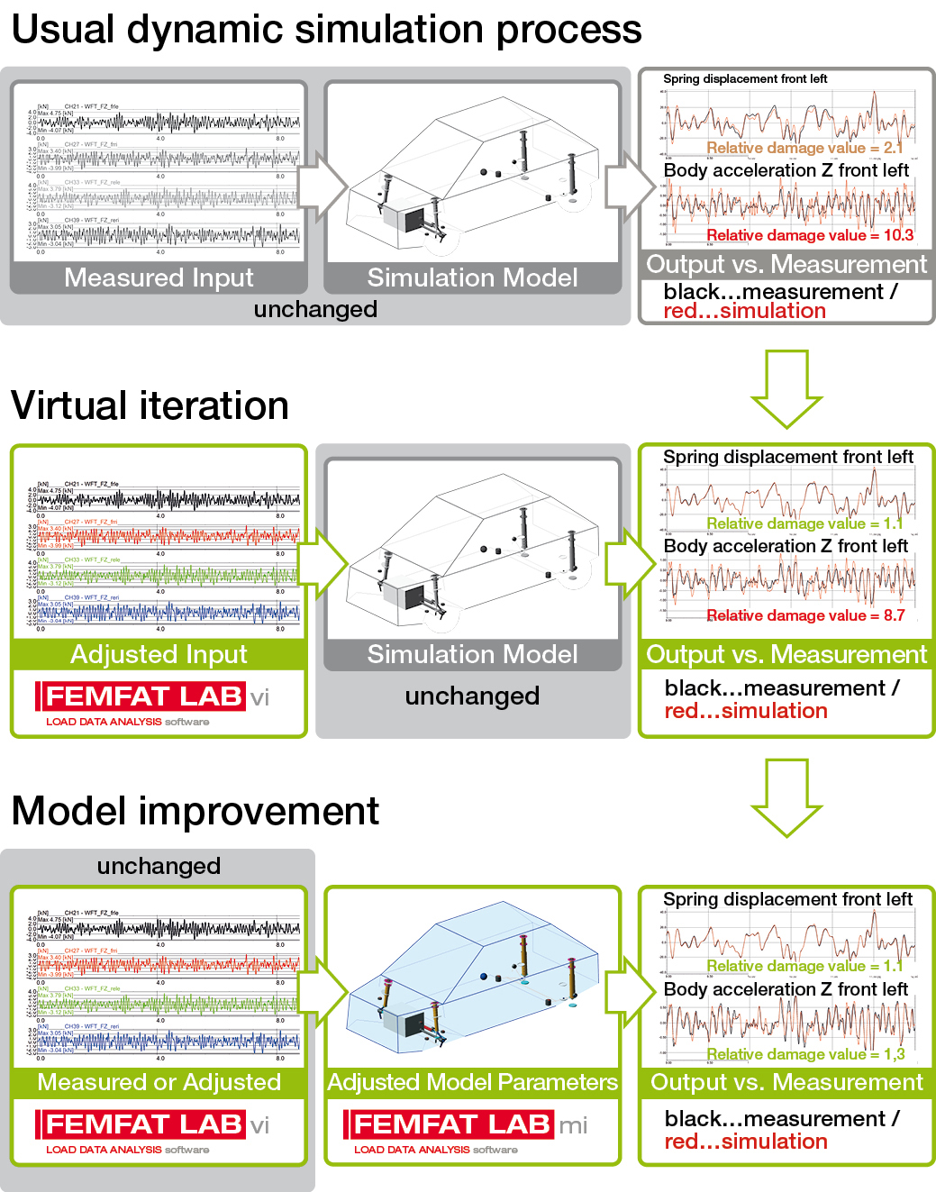 Virtual iteration is based on determination of the excitation of a model in the time domain using dynamic simulation (usually multi-body simulation). Using the iteration process with simulation analogous to the real test bench allows to adjust external loadings on a structure in such a way that internal measurements, i.e. proper load flow, ca be reproduced with desired accuracy (solution of a non-linear inverse problem). This can be used to replace procedures such as the time-consuming measurement of bearing or spindle loads. However, measuring the internal signals are usually relatively simple (e.g. wheel center or body accelerations, suspension travels, etc.).